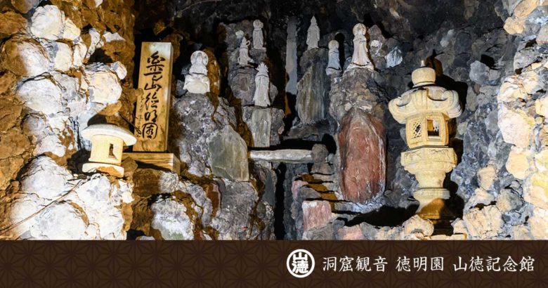 洞窟内の坑道は、長さ400メートルをこえ、幾多の巨石銘石を配した洞窟内の大小空間は、彼岸の楽土をイメージし、深山幽谷を写し、大瀑布、渓流になぞらえ、それぞれを背景に石彫の名工、楽山が生涯かけて彫刻した御影石の観音像39体が他の石彫群と共に安置され神秘的な法悦の世界を繰りひろげています