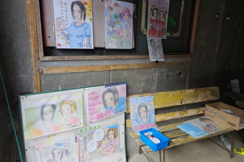 降りて中を覗いてみたら、壁のボードにイラストがいっぱい貼ってあった。