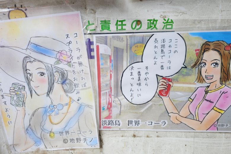 どうやら、ここ世界一コーラまで登る道が、アワイチサイクリングの難所の一つらしくて。南淡路水仙ラインの灘大川の激坂を登りきった場所にあるのが、このコカ・コーラの自販機なんだね。