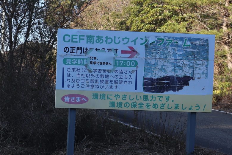 南あわじウィンドファーム!調べたところによると、門が開いてれば見学できるというじゃない。道も未舗装らしいけど、道も気持ちよさそうで。私のバイクじゃ余裕だろうって。