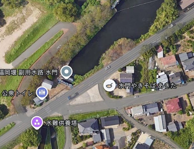 それに「福岡堰 副用水路」の水門のすぐ傍だから、店名が「水門焼きそば」なんだね。