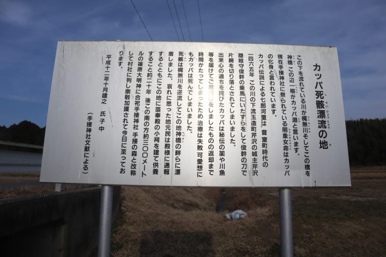 ざっくり要約すると、この一帯は「カッパ淵」と呼ばれ、室町時代の七郎河童という人物の伝承が由来。片腕を失い亡くなった後、この地に漂着し村人が祠を建てて供養した。のちに手接神社に合祀され、今も地元で敬われている…そんな感じ?