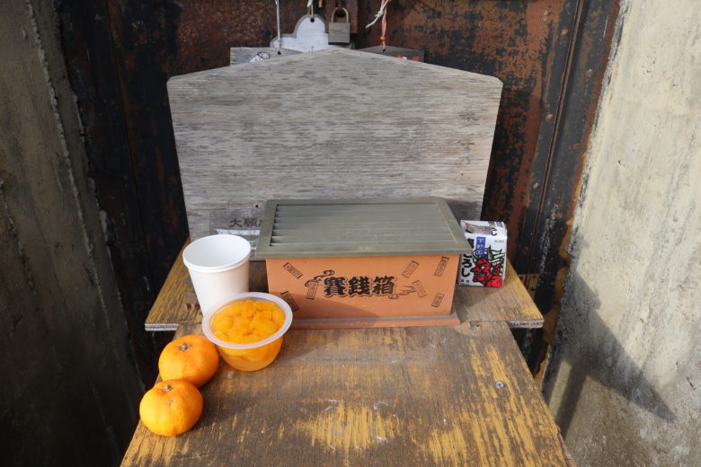 鬼ころしとみかん🍊、それと今開封したようなみかん🍊ゼリーが置いてあった。誰かが参拝して行ったんだね。