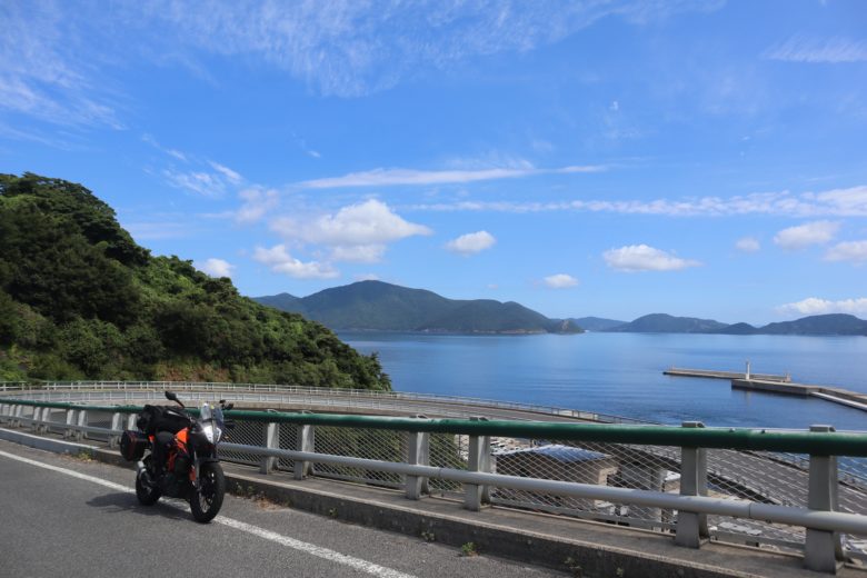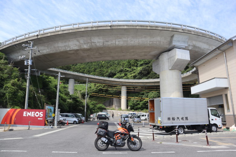 バイクの上に見える、この特徴的なループ橋は知夫里大橋といって、港と県道知夫島線を結ぶ全長180m、高低差は約50mもあって、知夫里島をおとずれた人は、ほぼ100%の人が通るであろう橋なのだ。
