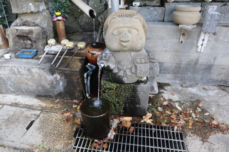 狸の腕からチョロチョロと流れる湧水。よーくみると、苔の生えてる狸の台座には文字が刻まれてる。